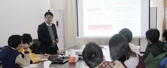 刘传周研究员的报告主要分四个部分进行详述:1)大洋俯冲过程与物质循环;2)Re-Os同位素体系;3)俯冲过程中Os的活动性;4)New Caledonia (新加里东尼亚) 蛇绿岩及Os同位素。首先,刘传周研究员形象地借“The Subduction Factory”(俯冲工厂)的卡通模式讲述了洋壳俯冲过程中变质交代作用以及物质循环,随后讲述了Re-Os这对强亲铁/铜元素对的同位素体系的发展,以及对示踪洋壳俯冲过程中物质循环的优越性、Re-Os同位素实验的艰难和需注意的科学关键点。最后,以New Caledonia (新加里东尼亚) 蛇绿岩为case study (个例研究),提出(a)Os在俯冲板片浅部熔融过程在是不活动的,主要富集在残存的硫化物中;(b)在俯冲板片深部熔融过程中随着硫化物的分解,又变得很活跃,易于向上迁移等两个主要的学术新观点。