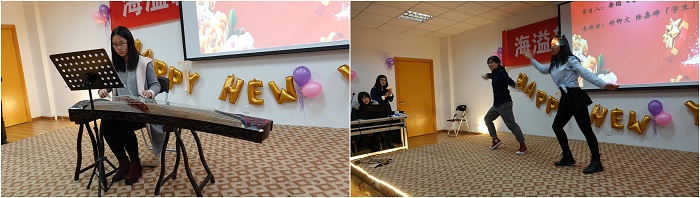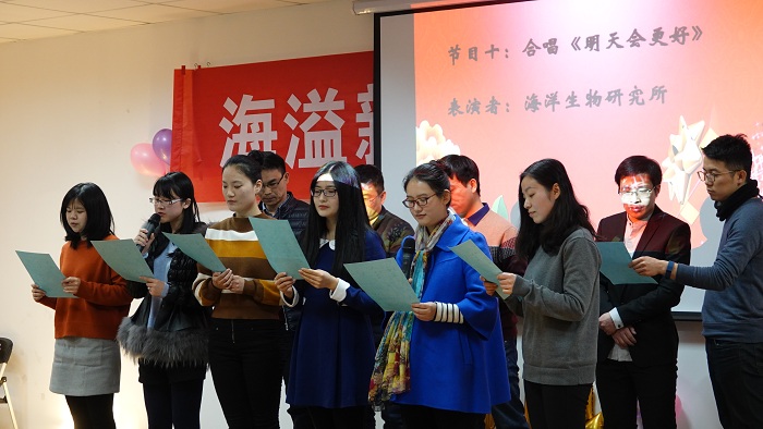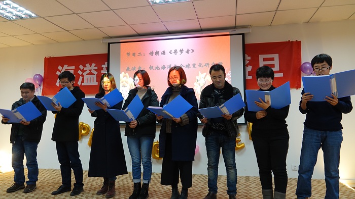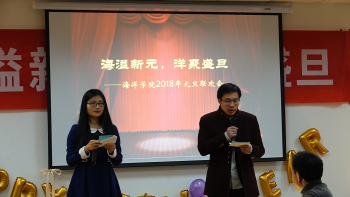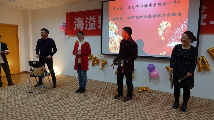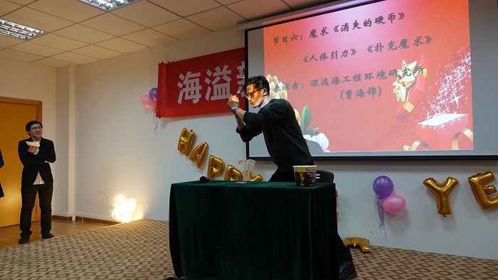 接下来的联欢会中,老师们各展所长,把现场气氛不断推向高潮。海洋观测与数值模拟实验室老师们的一曲合唱《相亲相爱一家人》和三句半《成人抖音 这一年》,既让我们感受到温馨的大家庭氛围,还让我们体会了对学院建设的真情洋溢;极地海洋与全球变化研究所的诗朗诵《寻梦者》、院办的诗朗诵《海之子》和海洋地质研究所的合唱《勘探队之歌》,道出了我们追寻海洋梦的澎湃心声;金兴坤、鲍威、王书昆、张帅等四位老师的歌曲串烧,点燃老师们年轻萌动的热火;深远海工程环境研究所曹海锦老师的魔术表演《消失的硬币》《人体引力》《扑克魔术》,带领我们进入神奇的魔术世界;海洋生物研究所的合唱《明天会更好》,更让我们斗志昂扬,带着期许走向明天。学生表演了助兴节目古筝独奏《女儿情》与舞蹈《告白气球》,尽显学生的青春活力和多才多艺。