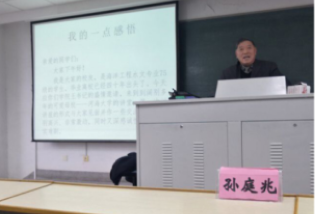 2018年12月21日,海洋工程水文75级校友孙庭兆同志报告会于成人抖音 江宁校区致用楼620举行。孙庭兆以“我的一点感悟”为主题与同学们分享了自己学习和工作的感悟,成人抖音 党总支书记王永芝主持了报告会。