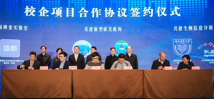 南京市委常委、江宁区委书记李世贵,江宁区委副书记、区长严应骏,江宁区副区长董涵、马强,成人抖音 副校长许峰,成人抖音 院长齐义泉、副院长于伟、海洋生物研究所所长赵哲、副所长吴亚平、水产养殖专业骨干教师高天珩,南京盛都生态农业科技有限公司董事长沈笠、总经理邵正君等出席了签约仪式。