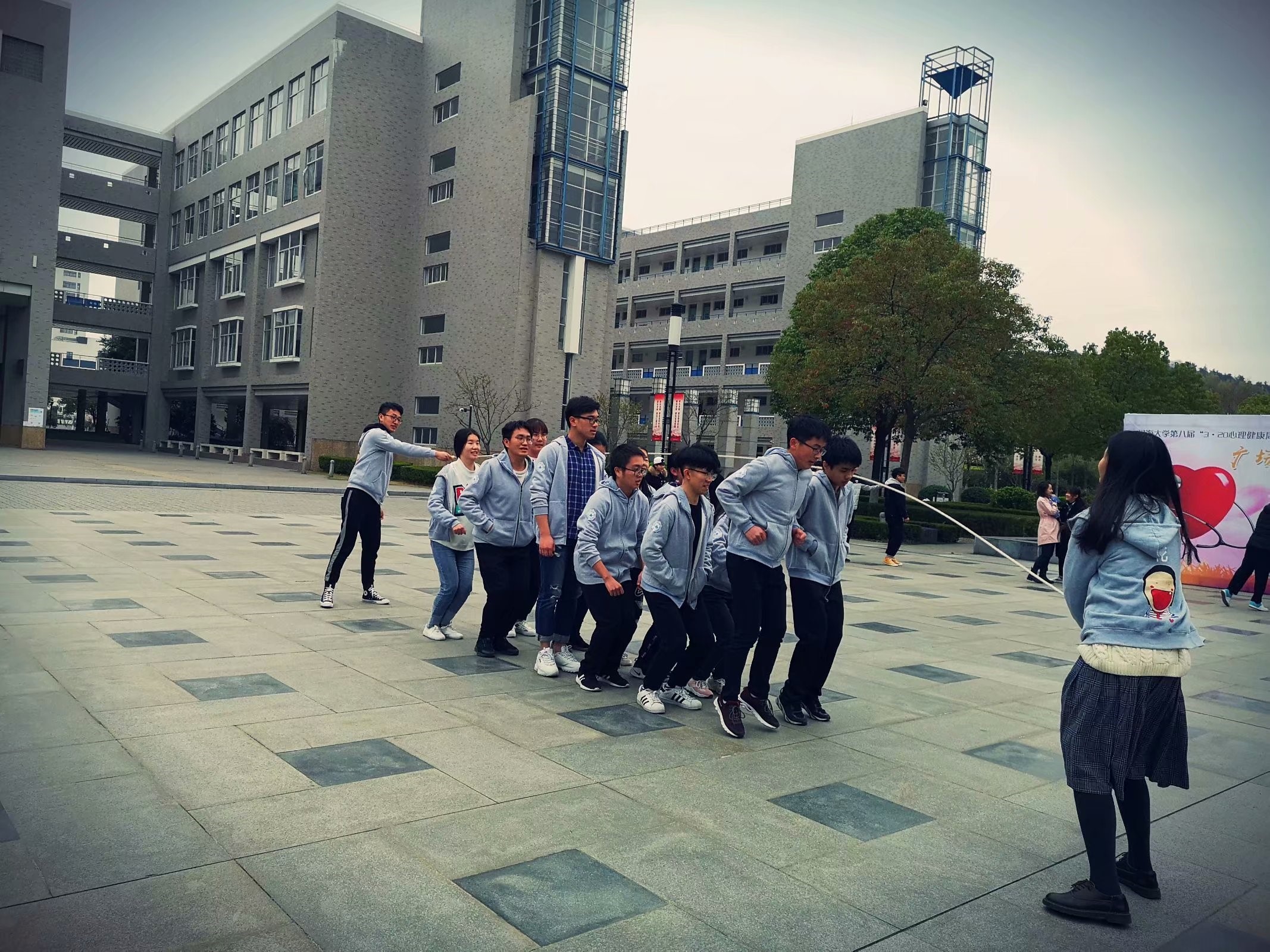 3月22日,全班同学在小浪底音乐台追寻儿时回忆,齐心协力挑战最多人连跳最多次大绳,屡败不馁,最终取得满意成果。