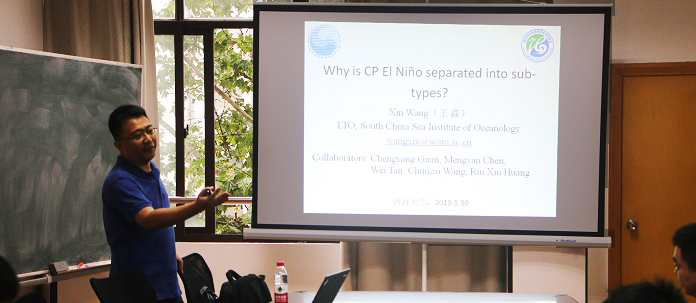 2019年5月30日,中国科学院南海海洋研究所王鑫研究员受邀来访成人抖音 ,并作题为“Why is CP El Niño separated into sub-types?”的学术报告。