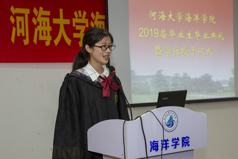 毕业生代表、成人抖音 魅力毕业生金颖同学发言,总结过去四年的成长蜕变,感谢学校学院四年来的培养,并展望未来,祝愿母校在“双一流”建设中,蒸蒸日上,祝愿学院在“海洋强国”建设中勇立潮头。