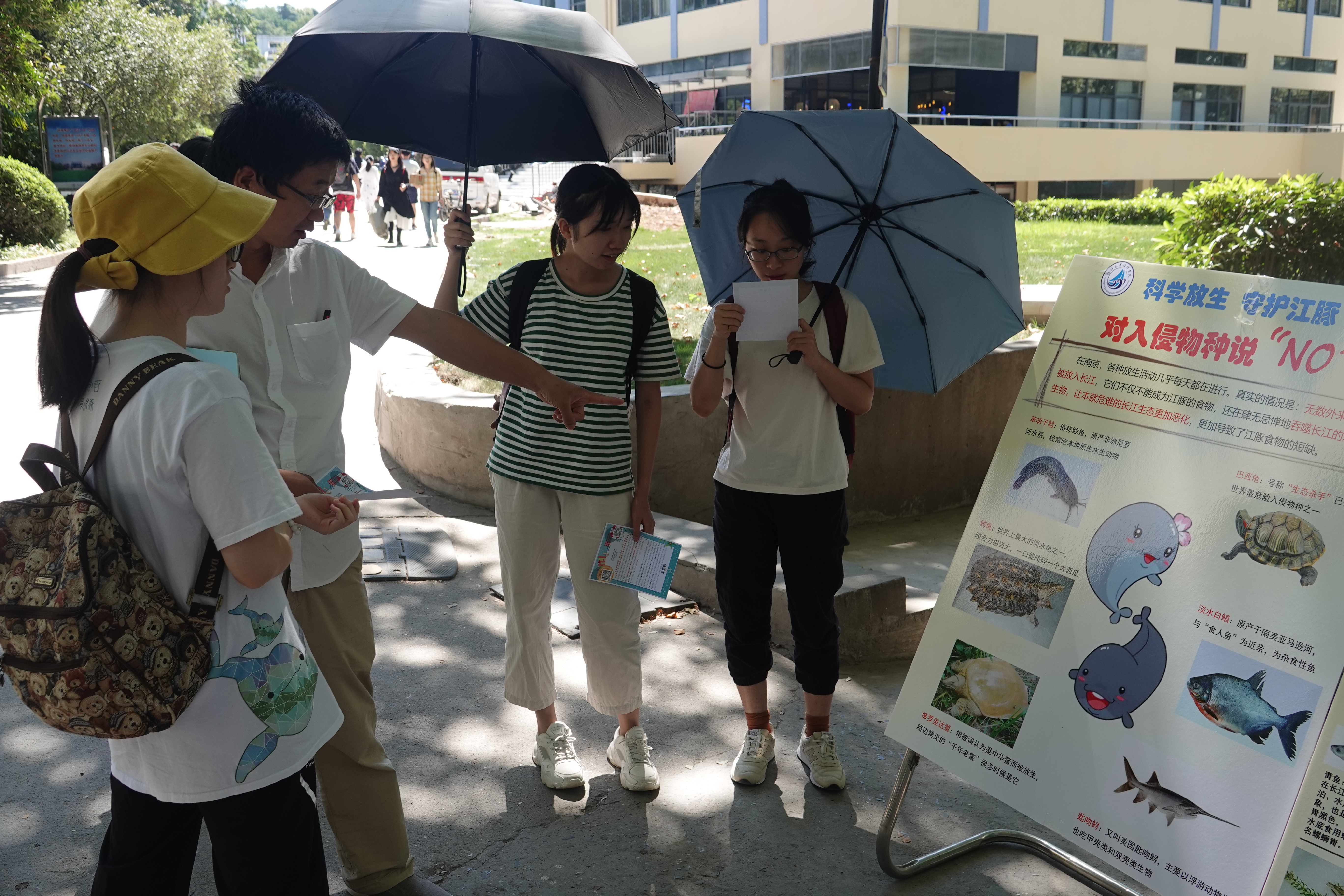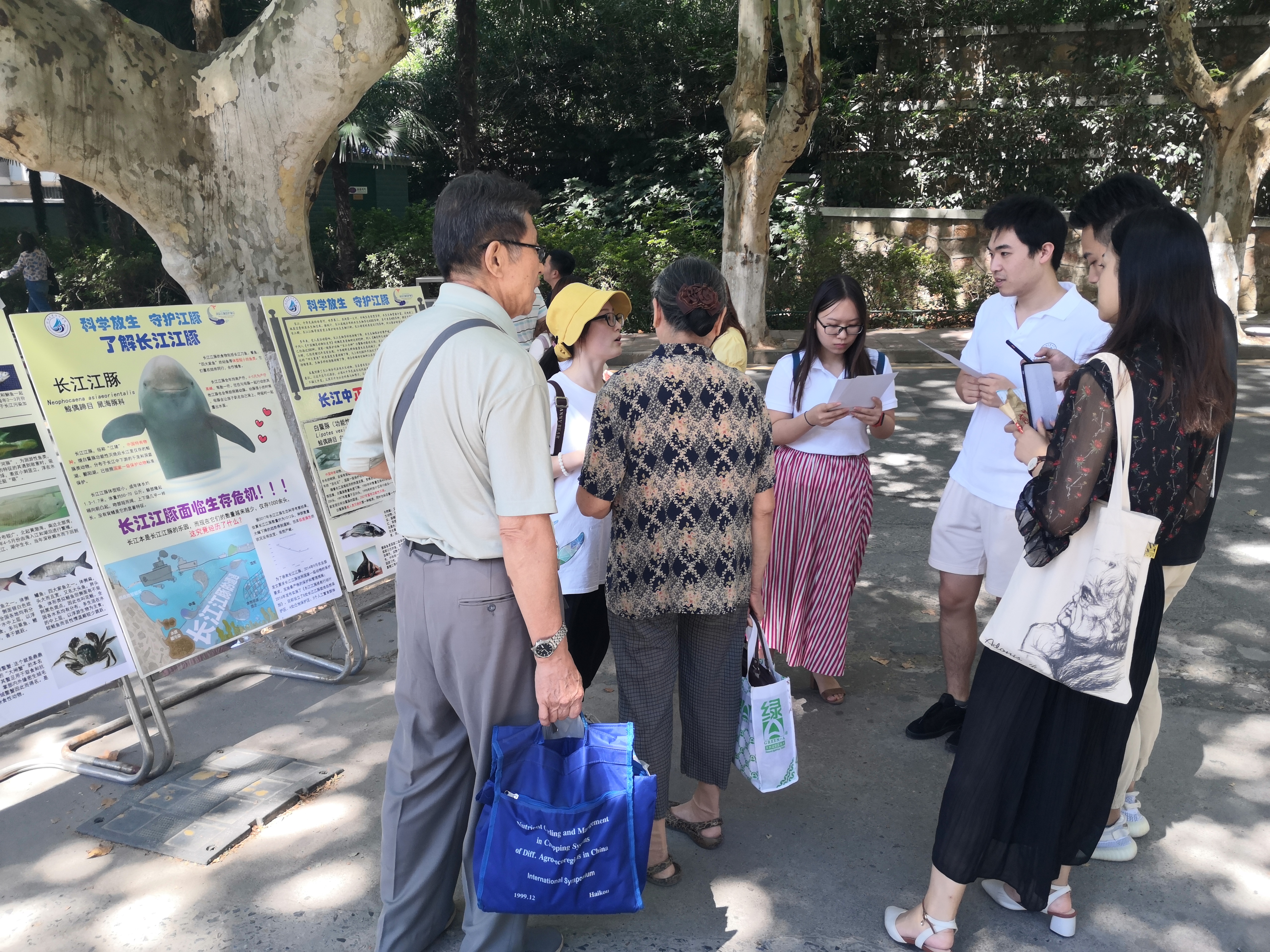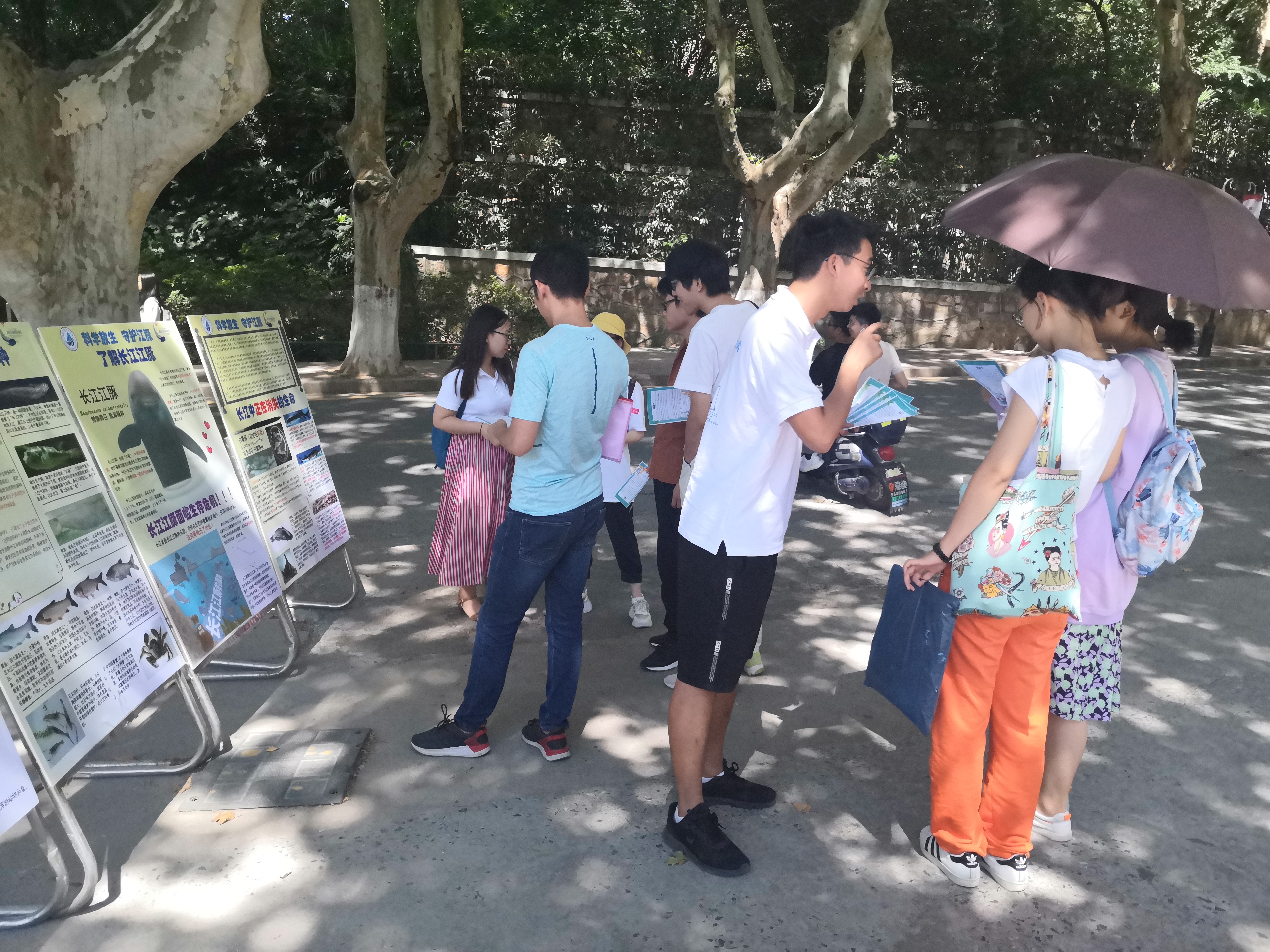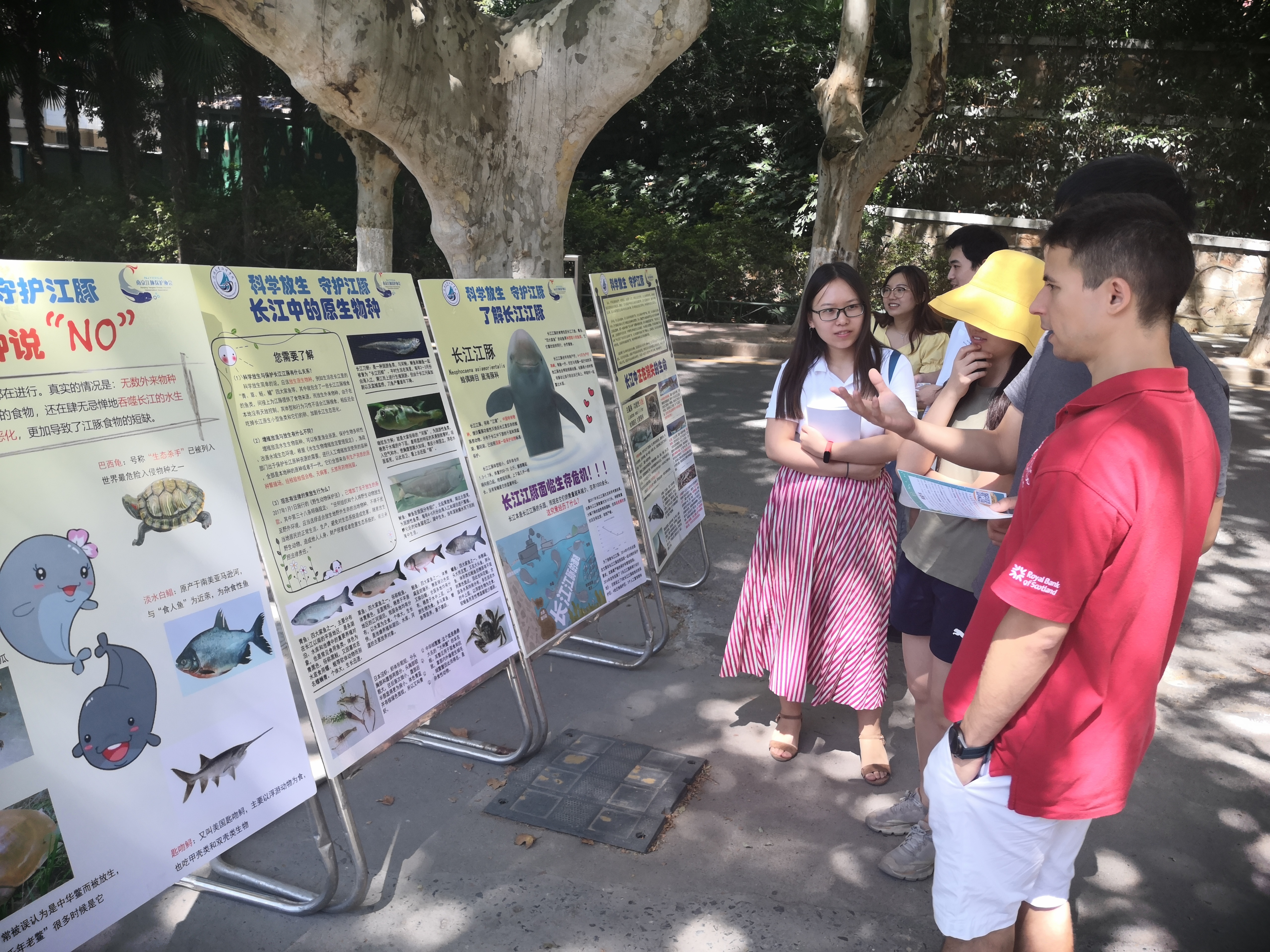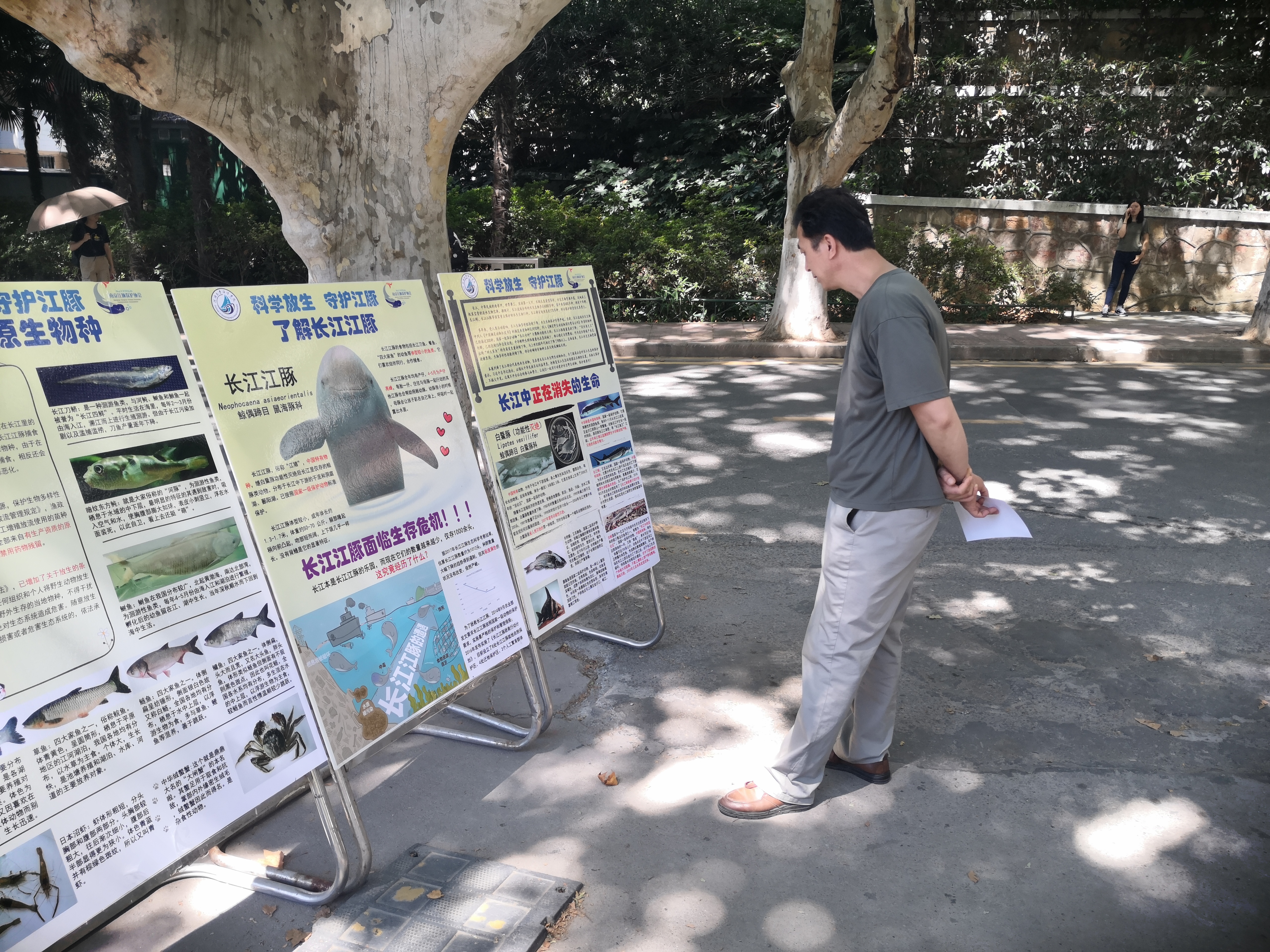 在活动快结束时,来了一位对长江环境问题十分关心的管理人员,他告诉我们经常看到很多人往秦淮河、长江里放生各种鱼、龟之类的生物,一开始以为这不会对水生态环境有影响,今天看了展板之后,确实应该加强宣传科学放生,更加注重生态保护。 同时还有一队路过的工程人员,他们在展板前讨论起南京4号线地铁在建设期间,重视对江豚等长江生物的保护,并表示这一做法非常有必要。