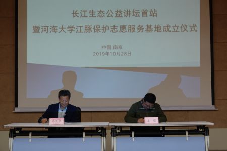 2019年10月28日下午4:00,长江生态公益讲坛首站暨成人抖音 江豚保护志愿服务基地成立仪式在成人抖音 江宁校区行政楼一楼会议室隆重开展。中国科学院水生生物研究所王丁研究员、中国水产科学研究院长江水产研究所王成友副研究员、南京江豚保护协会副会长兼秘书长姜盟先生、副秘书长徐萌女士、白鱀豚基金会项目负责人邓晓君女士、成人抖音 院长齐义泉教授、海洋生物系主任赵哲教授等出席活动,会议由学院党总支王永芝书记主持。