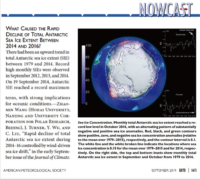 2019年9月出版的美国气象学会会刊(Bulletin of the American Meteorological Society,BAMS)在Papers of Note部分介绍了成人抖音 一项研究成果。南极海冰月平均范围于2014年9月达到有卫星观测以来最高,随后以前所未有的速度减退,2016年10月达到创纪录低值。王召民教授团队与英国南极局John Tuner教授合作,研究了近几年南极海冰快速减退的成因。研究成果于今年9月在Journal of Climate正式发表(文章链接://journals.ametsoc.org/doi/full/10.1175/JCLI-D-18-0635.1)。