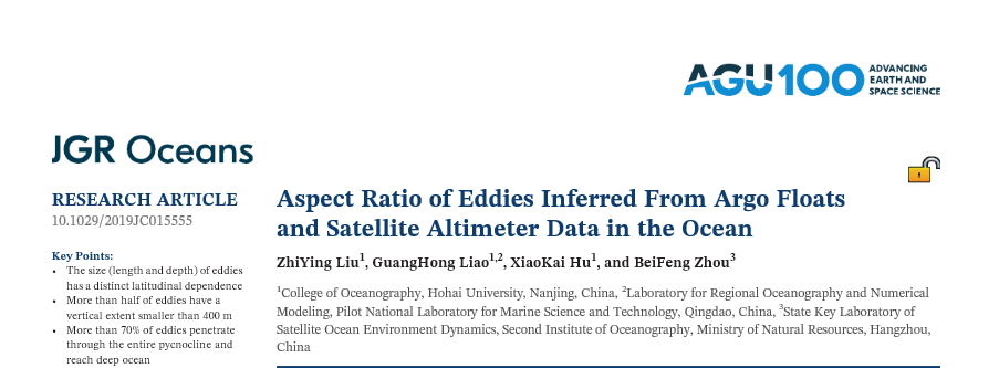 成人抖音 物理海洋系2018级硕士研究生刘志颖等在导师廖光洪教授的指导下,采用高度计资料和Argo剖面浮标观测资料,研究分析了准全球海洋涡旋的纵横比以及涡旋的垂直尺度分布的地理特征。