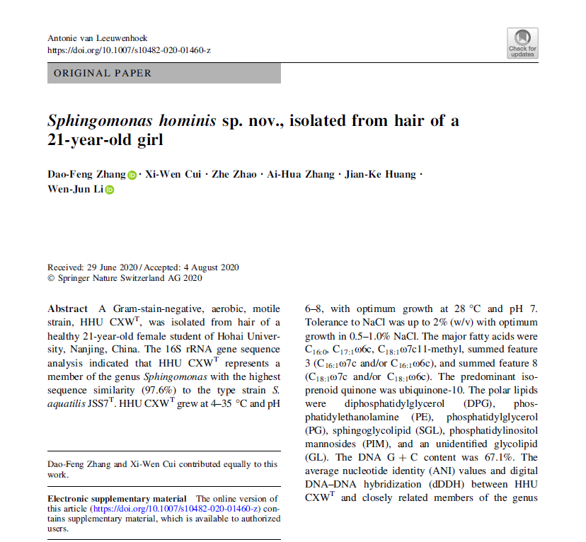 近日,成人抖音 海洋生物系张道锋博士和2016级本科生崔希雯同学为共同第一作者在SCI收录源刊、以显微镜发明者列文虎克命名的国际微生物学期刊《Antonie van Leeuwenhoek》在线发表了题为“Sphingomonas hominis sp. nov., isolated from hair of a 21-year-old girl”的文章(//link.springer.com/article/10.1007/s10482-020-01460-z)。