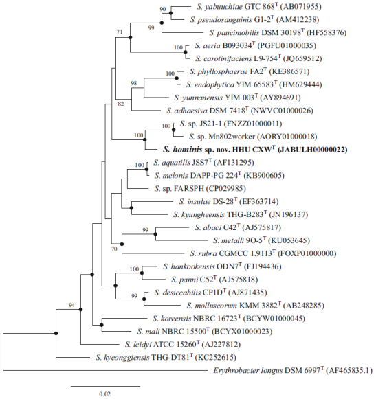 鞘脂单胞菌属隶属于阿尔法变形菌纲,广泛分布于陆地和海洋环境,尤其是水体、沉积物、植物内生和根际等,个别类群也可出现在人体体表。鞘脂单胞菌在医药、环境和农业生产等方面具有很好的应用前景,如:有些菌株具有降解多环芳烃的能力;有些菌株可以用来生产鞘氨醇胶;有些菌株可以提高植物的抗旱、抗盐碱、抗重金属能力,并可以合成一些植物激素促进植物生长。此次Sphingomonas hominis的分离鉴定,为鞘脂单胞菌的相关研究提供了新的材料。