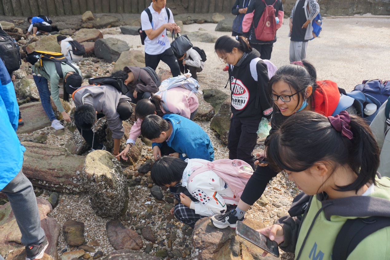 图七:高天珩老师带领同学们观察礁石上的牡蛎