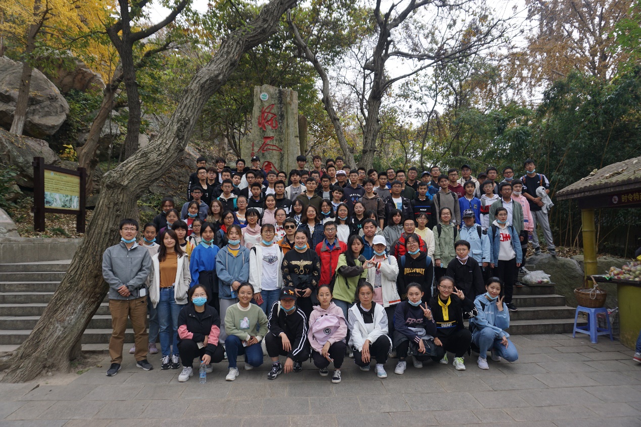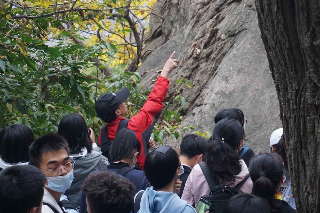 有了前一天的铺垫,第二天的花果山之行,同学们在“认石”过程中,显得更加得心应手。11月1日,老师和同学们来到花果山,花果山是国家重点风景名胜区,是国家地质公园。在老师们的带领下,同学们看到了因为多次地震形成的罕见的崩塌堆积奇石景观,观察了花果山上典型的混合岩和变质岩地质特征以及其他众多的地质遗迹,让同学们叹为观止。最后的实习阶段,大家都在为攀登花果山之巅---玉女峰(江苏最高峰)而战斗,在正常的实习任务之余,这不仅是对体力的考验,更培养了同学们的恒心和毅力。