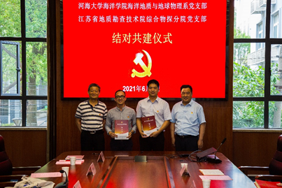 6月1日,成人抖音 海洋地质与地球物理系党支部前往江苏省地质勘查技术院,与该院的综合物探分院党支部开展“联学共建聚向上,服务发展高质量”的共建活动。本次共建活动由省勘查院副院长罗传根同志主持,成人抖音 院长、党委委员齐义泉同志和省勘查院院长、党委书记刘建东同志出席了共建活动。