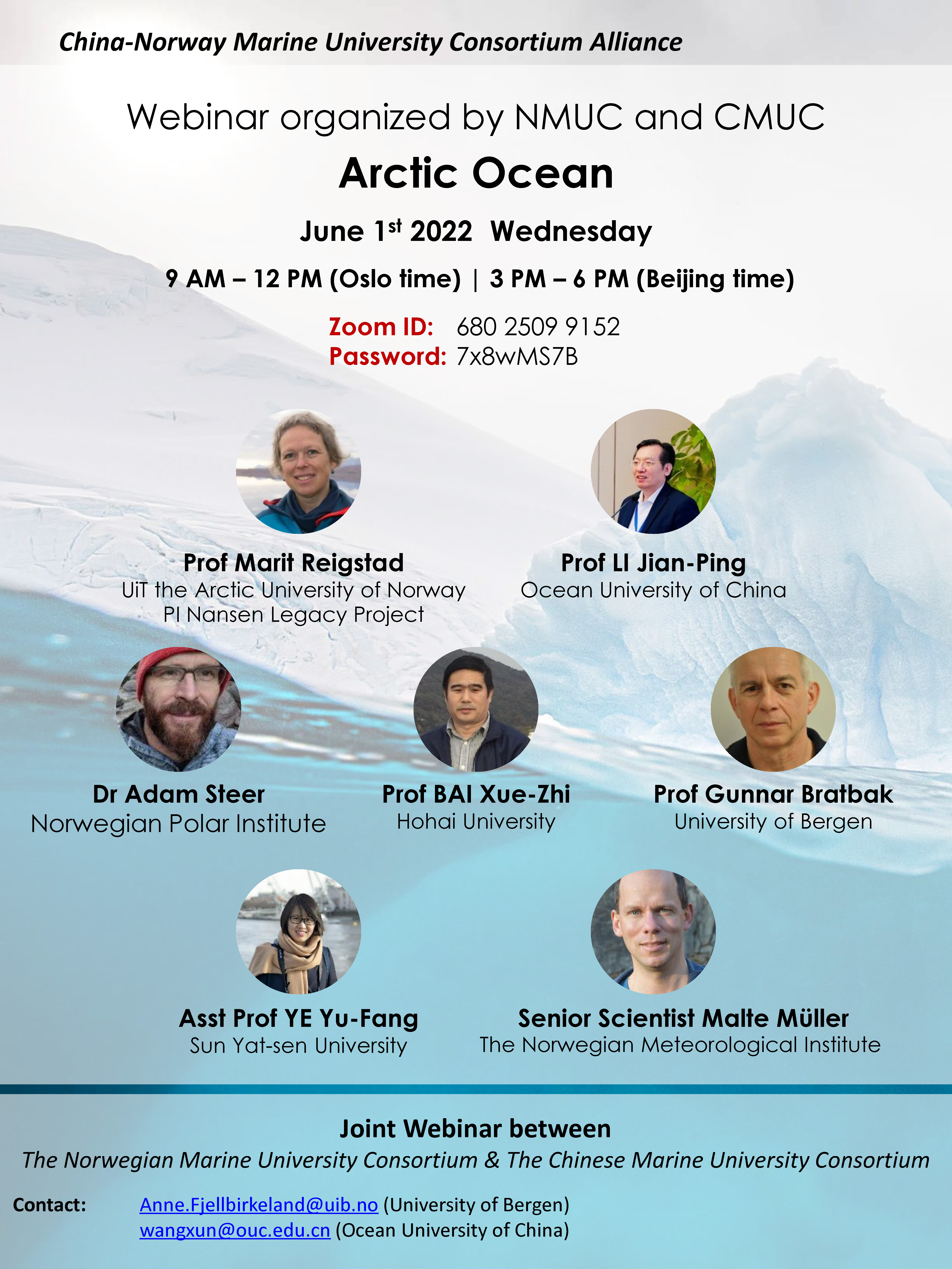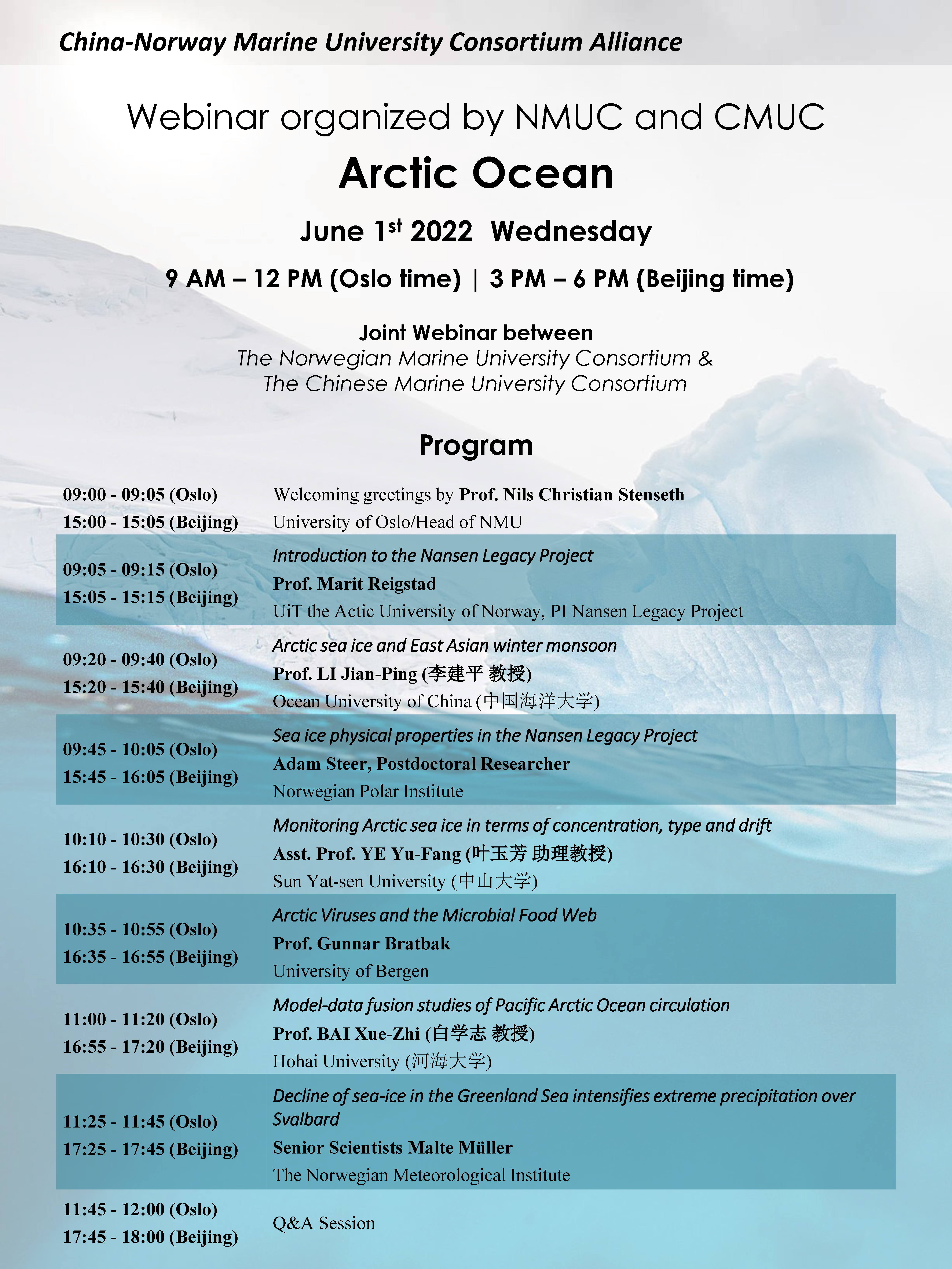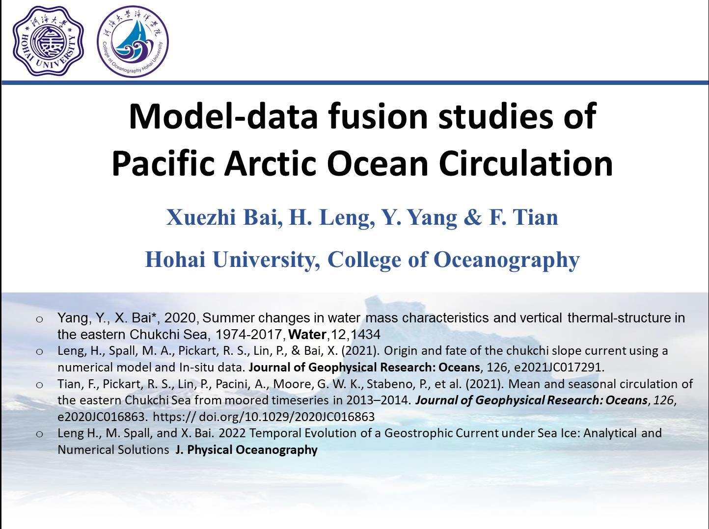 北京时间2022年6月1日15:00-18:00,中国-挪威海洋大学联盟第一次主题线上研讨会: Arctic Ocean于线上召开,会议邀请了多位国内外知名专家学者,成人抖音 白学志教授受邀参加并做了题为‘Model-data fusion studies of Pacific Arctic Ocean circulation’的学术报告。