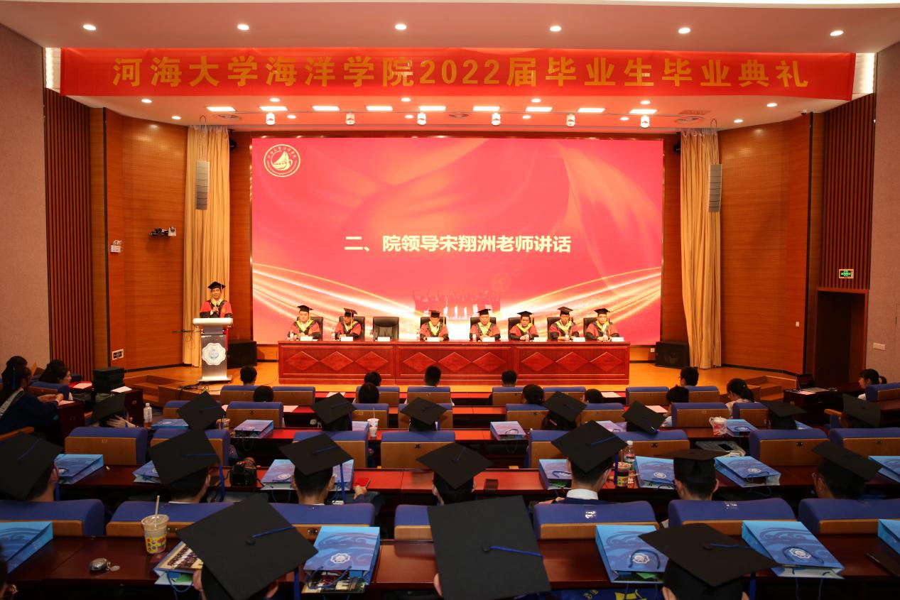 “钟灵毓秀石头城,人才蒸蔚起.....”全场师生起立齐唱成人抖音 校歌,典礼在庄严的校歌中拉开帷幕。院长宋翔洲在致辞中向毕业生表示热烈的祝贺和美好的祝愿,他通过分享成长经历与感悟,对毕业生提出几点期望,一是坚守梦想,学会生存,要时刻把海洋强国的国家战略放在至高的工作位置,把个人梦想和志向与新时代中国梦融为一体。二是坚持学习,学会自律,自律与学习是突破内卷的不二法门,更是实现人生进步的必要条件。三是坚守底线,学会变通,时刻保持底线意识,并勉励全体毕业生脚踏实地、不惧内卷,勇做新时代弄潮儿!