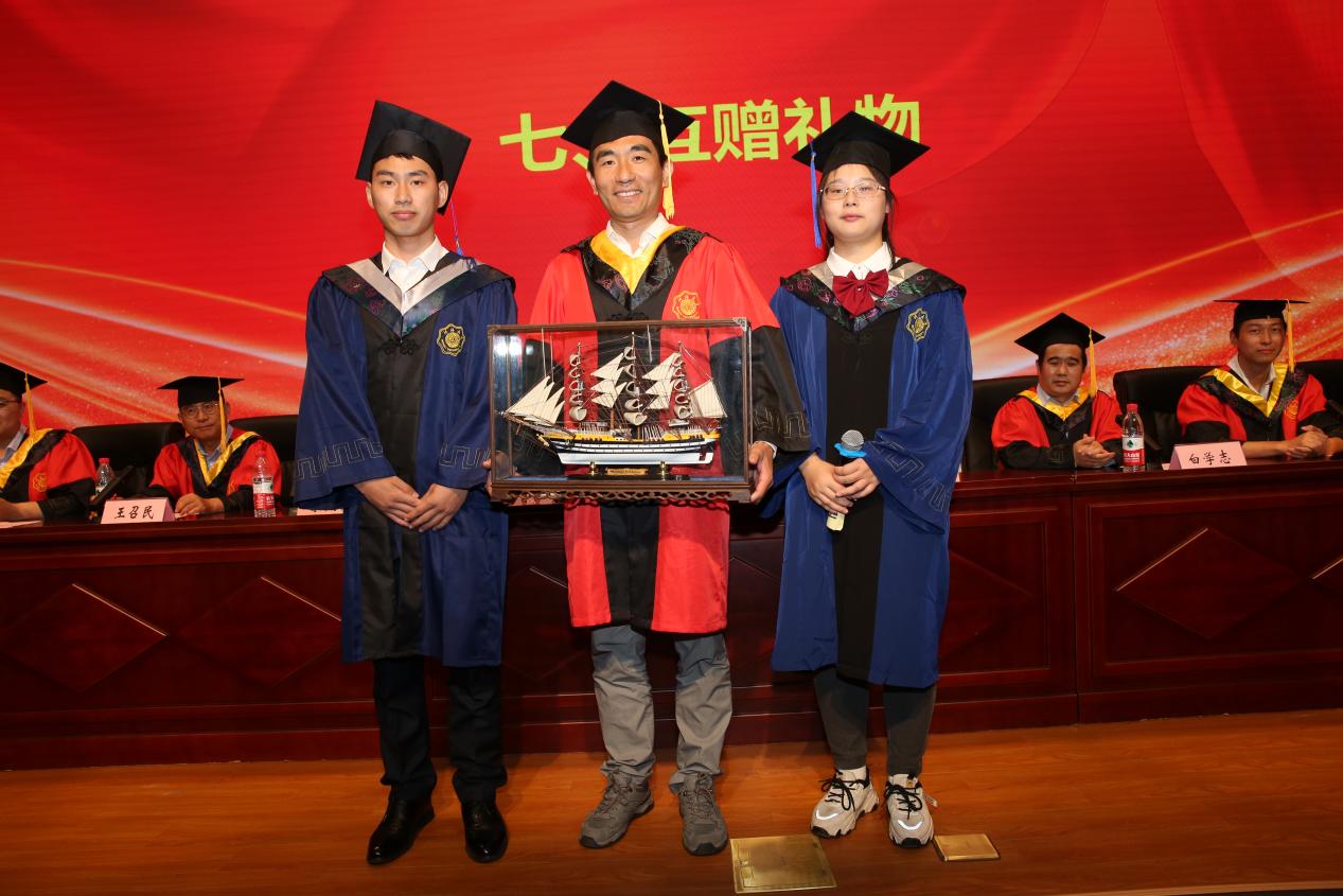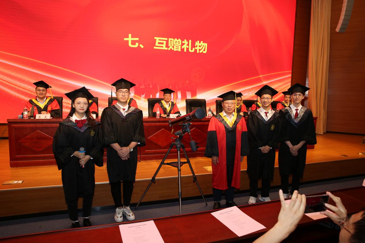 齐义泉为毕业生代表赠送学院精心定制的戒指并致以真挚的祝福,让祝愿与期盼一直陪伴毕业生走向未来征途,研究生代表向学院赠送一艘韦斯普奇号高桅横帆船模,寓意一帆风顺,扬帆远航,表达对成人抖音 及成人抖音 的美好祝福。本科生代表向学院赠送一架可以自动寻找星体方位的特朗90DX天文望远镜,并祝愿学院蒸蒸日上,目之所及有璀璨星辰,心之所往为浩瀚大海。互赠礼物后,学院领导代表与学生代表合影留念并互道感谢与离别。