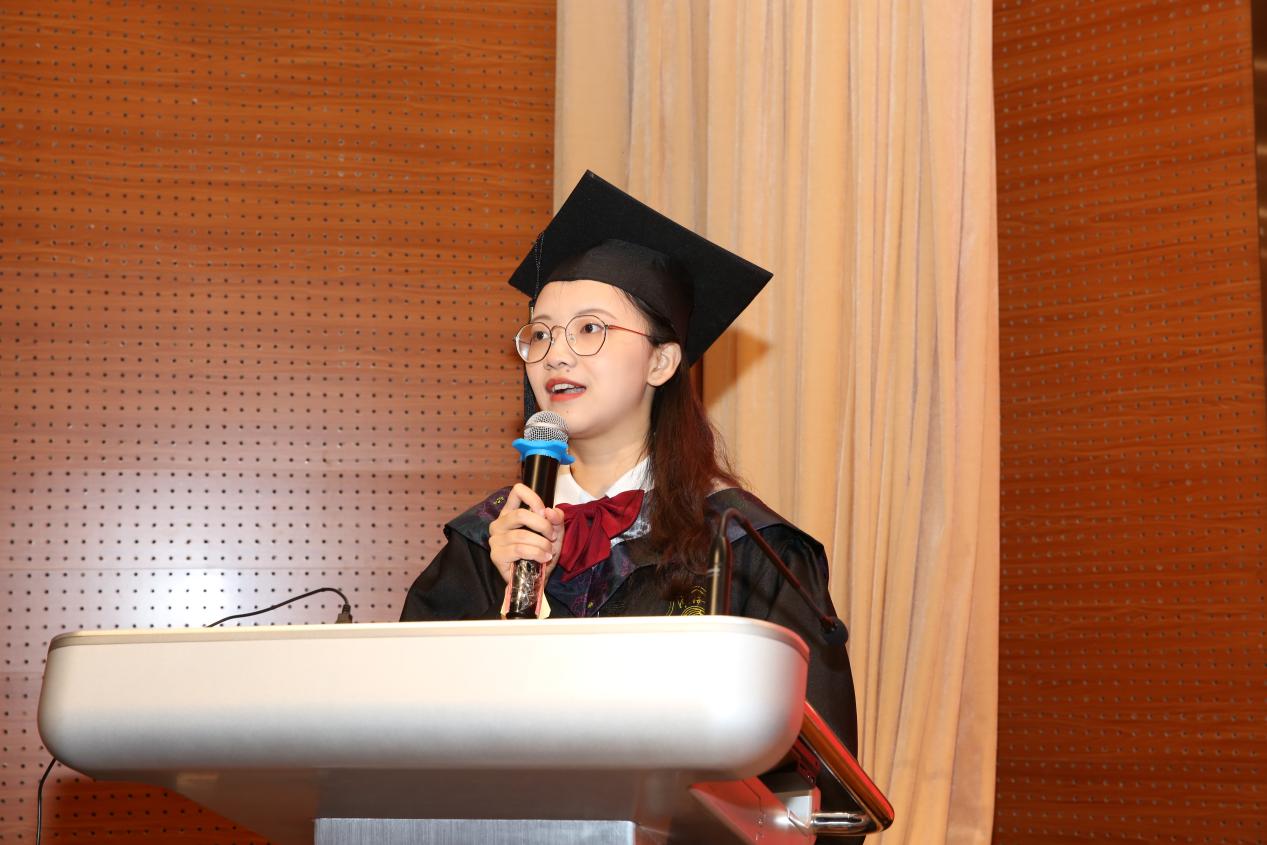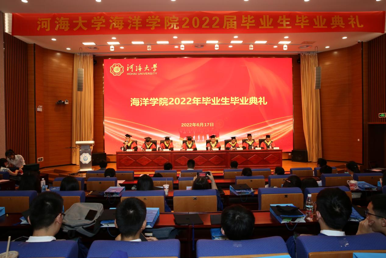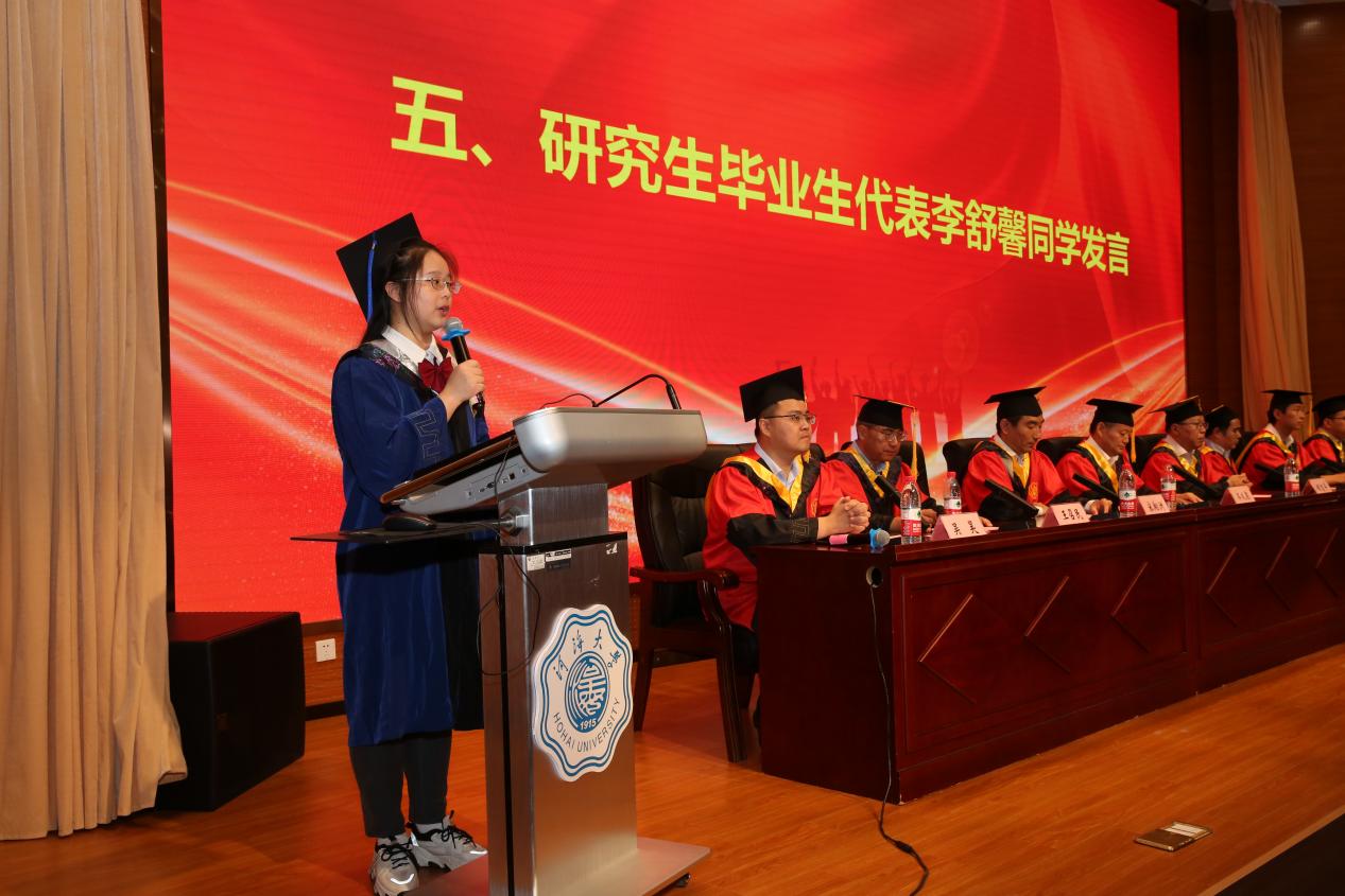 江苏省优秀毕业生李舒馨作为研究生代表回顾了三年科研生活的的点点滴滴,表达了对校园生活的怀念、对师长的感激以及对母校的祝愿。她表示,作为海洋学子,今后一定牢记恩师教诲,铭记母校校训,传承先辈精神,从感恩出发,从谦卑做起,认真做事,踏实做人。“一入河海,泽润四载。”本科生毕业生代表吴梦霞表达了对母校的感激之情,她总结道,青春是人生中最美好的年华,青春之美,美在奋斗与收获,美在遗憾,美在希望与征途,青春将永刻在岁月里,化成一股温暖的力量,让前行的路因回忆而充满无限阳光。
