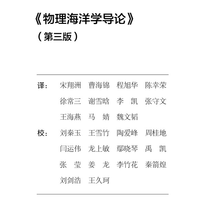 学院高度重视教材建设工作,将之视为提升海洋学专业课程教学质量的重要抓手。学院采取自主编写教材与引入国外经典教材相结合的方式,鼓励原创、兼容并包,近年来已出版高水平自主和翻译教材多部,初步建立了具有河海特色的海洋科学教材体系。该书的翻译出版,将形成本土教材和翻译引进的合力,服务本科生“物理海洋学”课程教学,服务于研究生“描述性物理海洋学”和“海气相互作用”课程教学。