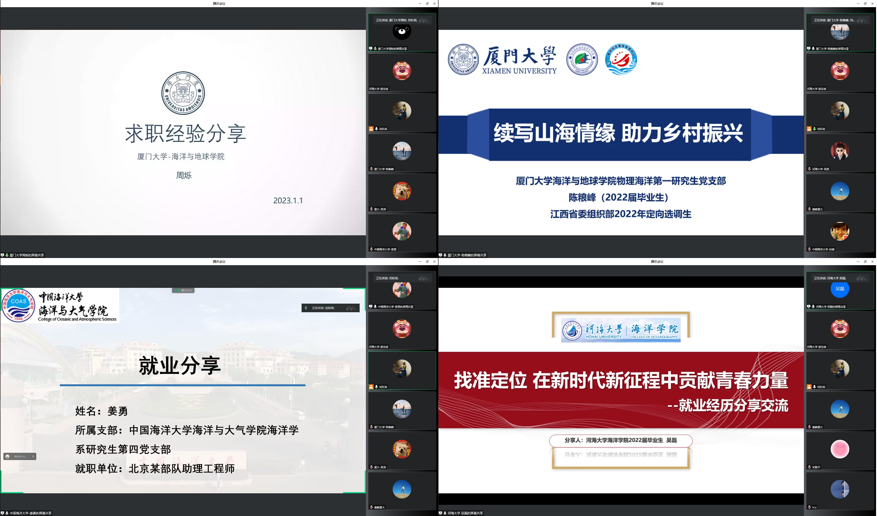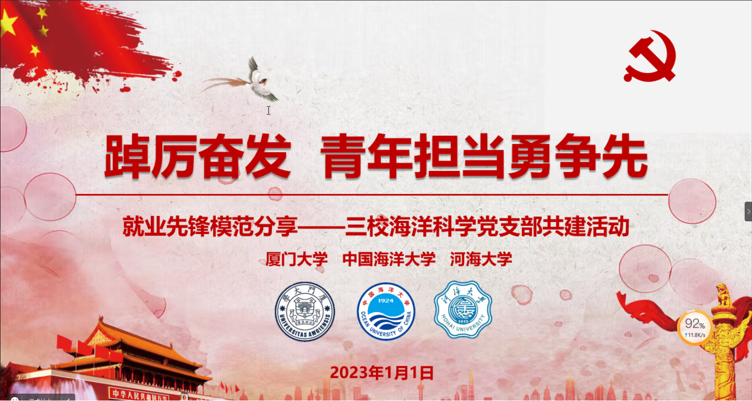 硕士党支部联合厦门大学、中国海洋大学的海洋科学学生党支部,举办“踔厉奋发,青年担当勇争先——就业先锋模范分享”支部“云共建”活动。