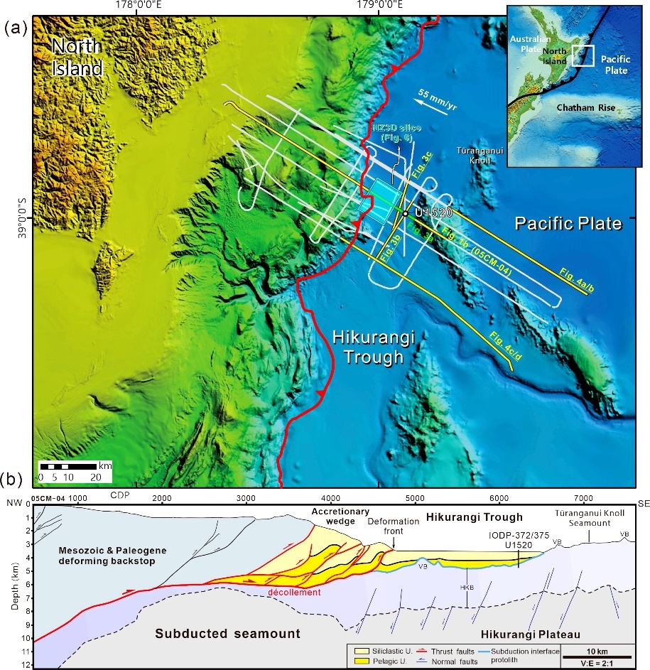 图1 a)研究区大地构造位置,灰色、白色及黄色代表二维地震反射剖面的位置,蓝色透明区块代表三维地震数据的位置, b)地震测线05CM-04的地质解释剖面揭示的希库朗伊俯冲带剖面结构