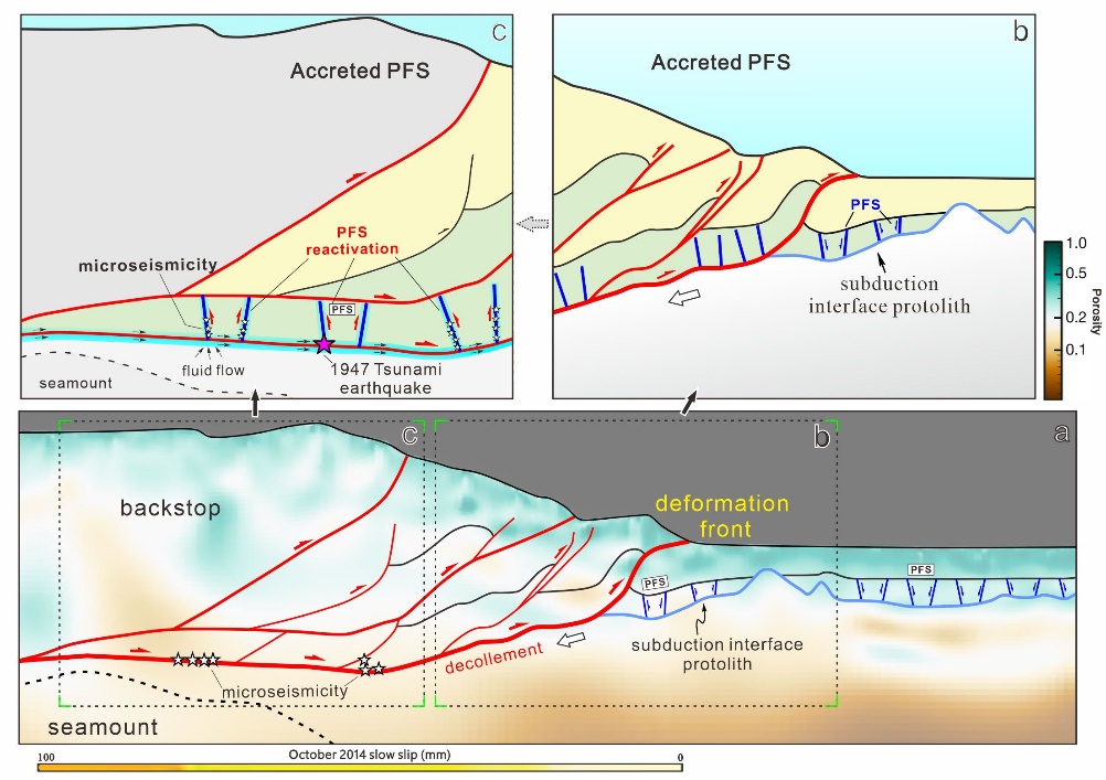 本研究指出俯冲带输入层序中发育的多边形断层可能在俯冲过程中影响板块界面的性质和上覆增生楔的构造变形及其演化。增生楔下部的继承性收缩构造的重新复活将会维持或者重新开启裂缝渗透性,并促进增生楔下部流体的向上流动或者沿着俯冲界面的流体渗漏。这些过程常被用来解释希库朗伊北缘的地震现象,包括地震震颤和突发型重复地震等。在全球其他俯冲带,特别是具有较厚碳酸盐和钙质泥岩输入层序的地方,这些细粒深海沉积单元中发育的继承性结构对浅部俯冲力学和增生楔演化的影响可能会被严重低估。
