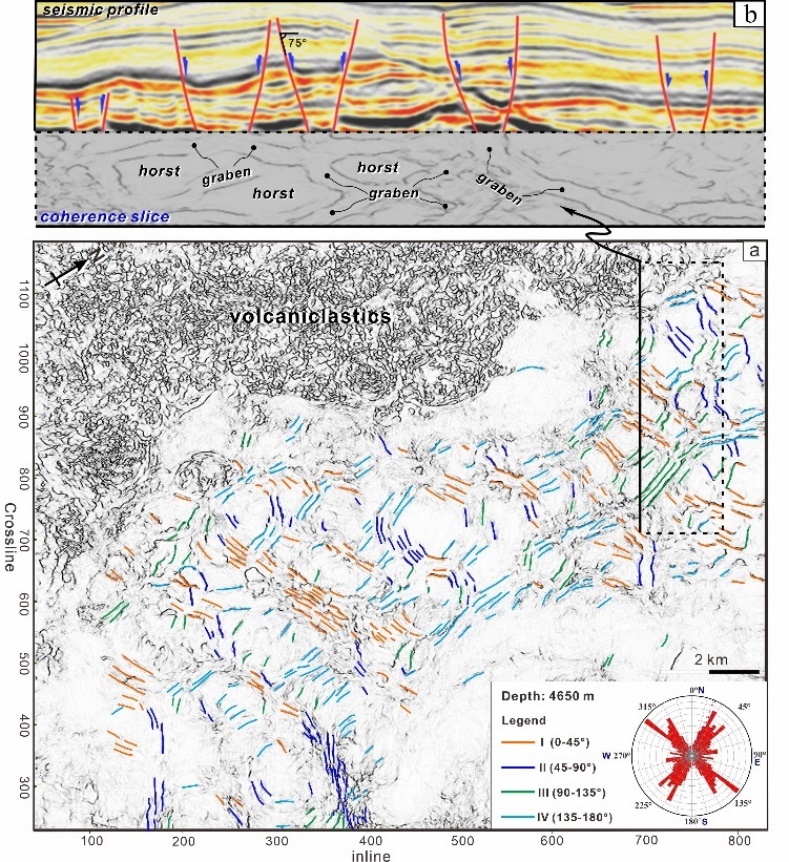 图3 a) 4650m深度的地震相干切片展示了输入深海钙质层序中的多边形断层的平面结构,b)水平地震相干切片与垂直地质剖面的折叠图