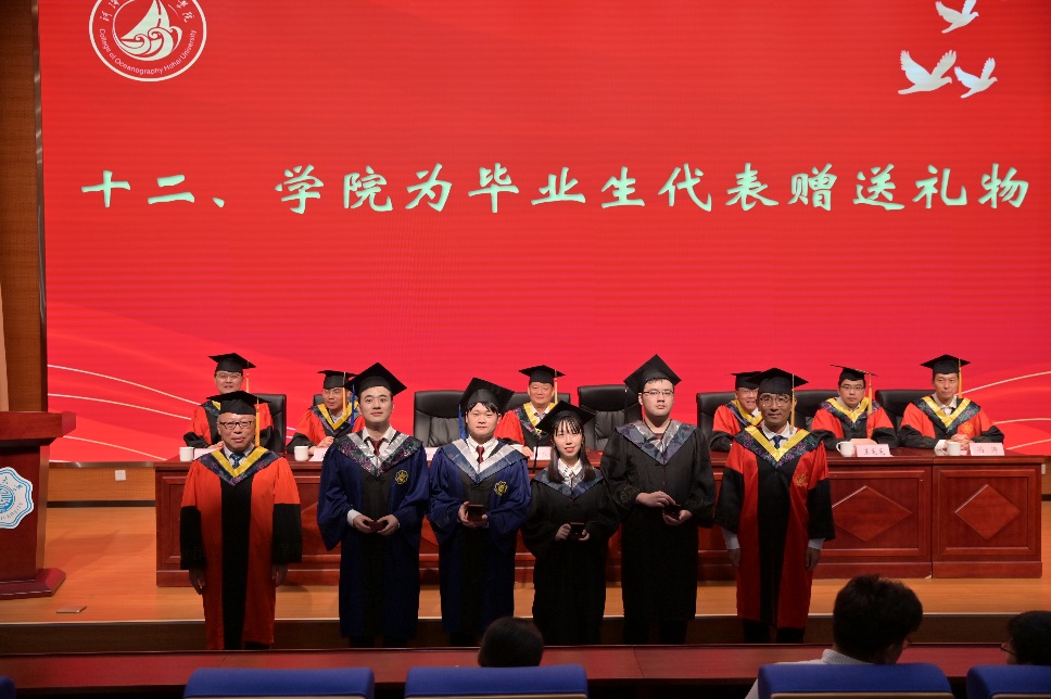 研究生代表向学院赠送一艘深潜器“蛟龙号”的模型,代表了2023届海洋科学硕士班对学院的祝福,希望学院继续“进军深海大洋,探索学科前沿,服务海洋经济”。本科生代表向学院赠送院楼照片的拼图,背后是所有同学的签名,拼图留存了2023届本科毕业生专属的河海记忆,承载了每一位同学对学院美好的祝福,祝愿学院蓬勃发展,蒸蒸日上。党委书记胡忠华、院长宋翔洲为毕业生代表赠送学院精心定制的戒指并致以真挚的祝福,让祝愿与期盼一直陪伴毕业生走向未来征途,赠礼物后,学院领导代表与学生代表合影留念并互道感谢与离别。
