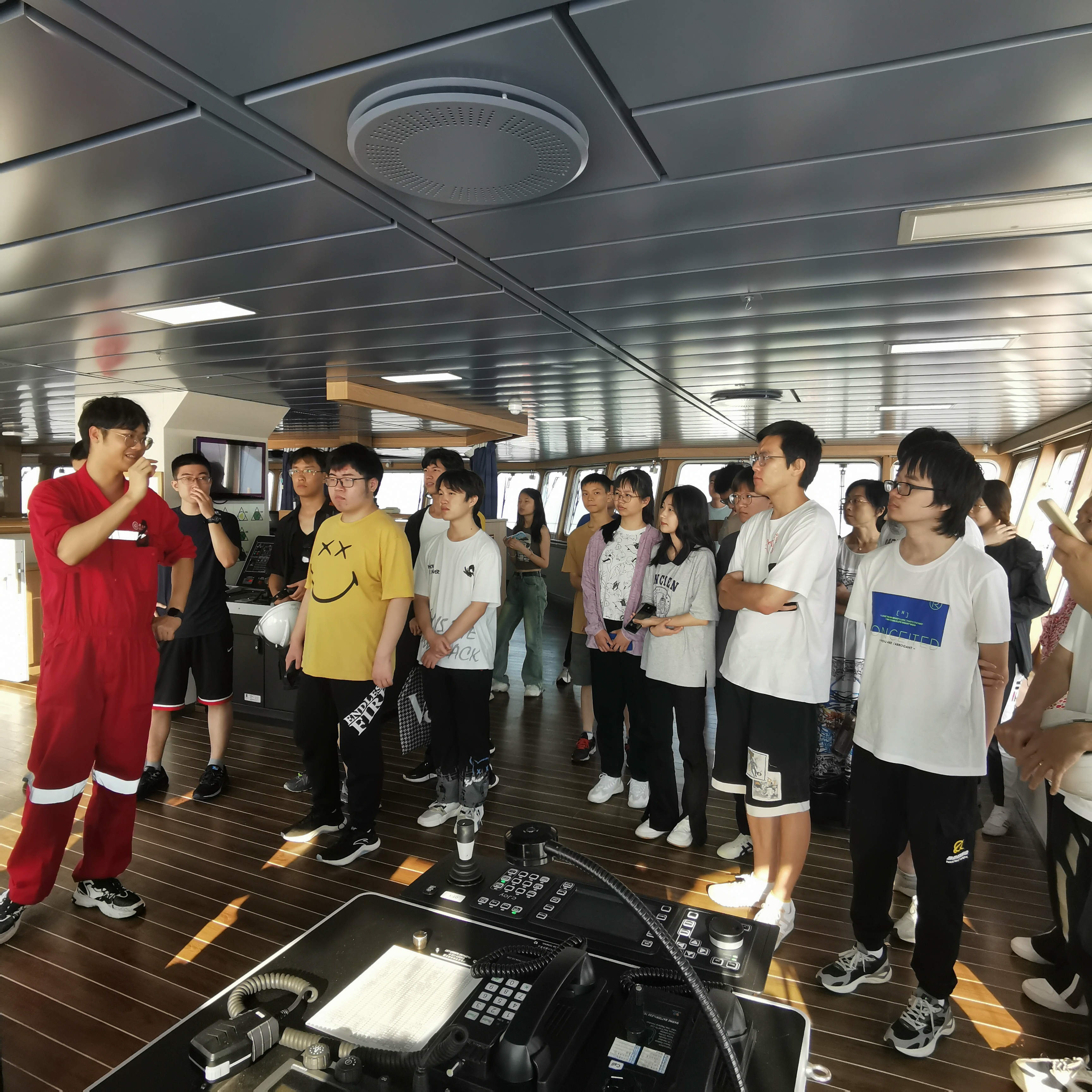 7月6日上午9点,成人抖音 师生在上海崇明岛由随船老师安排,有序地登上了“中山大学”号科考船。中山大学及相关单位高度重视本次海上科考实习,航行前董文杰(首席科学家)、于卫东(科考中心主任)、蓝明华(船长)、常越(领队)、崔廷伟(执行首席)等人为参航师生召开航次动员大会,介绍本次海上实习背景、注意事项等。下午,科考船在船员紧锣密鼓的安排下驶出停泊港口,船队三副为参航师生进行了系统的安全培训,随后探测部工作人员带领参航师生分组参观“中山大学”号各层设施、实验室和驾驶室并介绍船上相关仪器设备,让大家近距离感受到了“中山大学”号科考船的先进以及船上工作人员的热情。