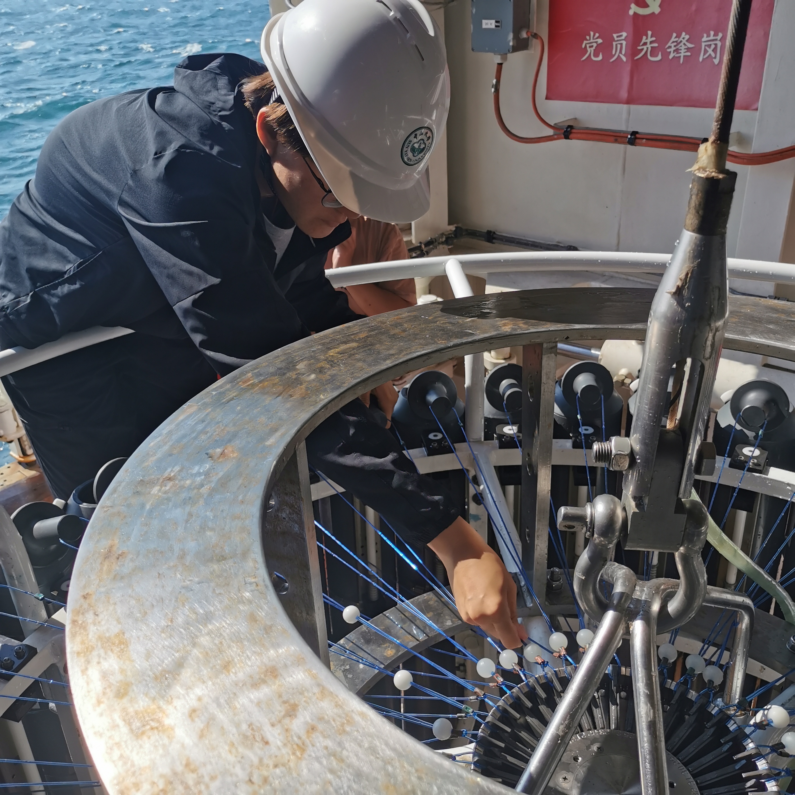 成人抖音 同学下放海洋水色观测圆盘并进行CTD挂瓶操作