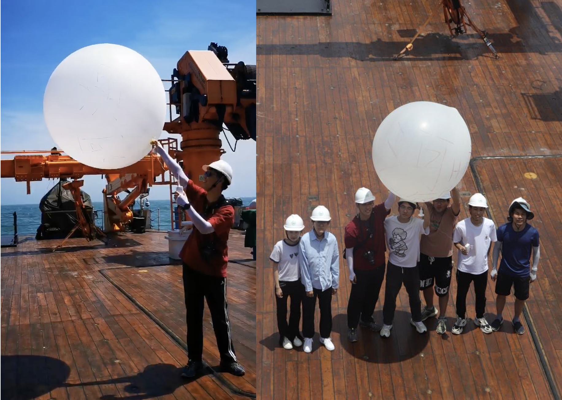 7月7号上午,“中山大学”号航行至台州沿岸海域站位,当天天气海况较差,遭遇了7级阵风,8级大浪,但成人抖音 六名学生经受住了大风大浪的考验,克服了晕船的不适,顺利完成了海洋气象观测实习内容。韩博副教授介绍探空仪器使用方式后,成人抖音 师生成功放飞探空气球,并在实验室实时读取传感器得到海上不同高度温度、气压、风速、空气湿度等海洋气象数据。随后在周海涛工程师的介绍下,了解学习了微波辐射计、激光风廓线雷达等气象观测仪器的使用及数据读取方式。在完成当天科考作业后,全体船员及参航师生进行了安全演习,熟悉了各项救生装置的使用及位置。
