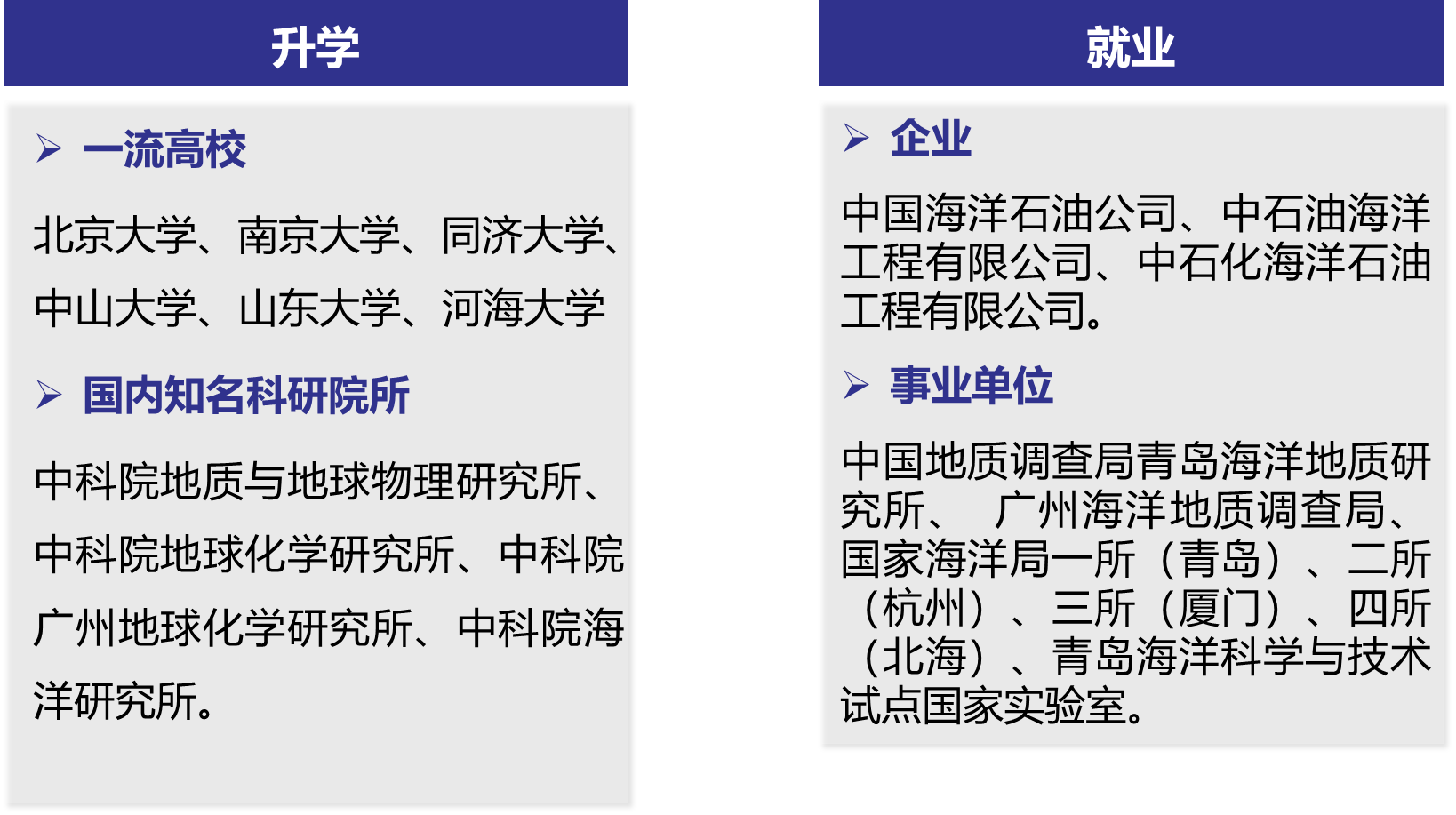 本专业方向的毕业生具有扎实的理论基础和良好的科研素质,深受国内外知名研究机构和国内企事业单位的欢迎。目前,海洋地质专业方向毕业的本科生、硕士研究生和博士研究生主要在国内外知名大学和科研院所从事相关科学研究,部分毕业生在国家企事业单位从事与本专业相关的管理工作。