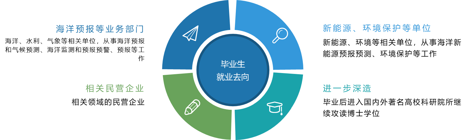 物理海洋学方向毕业生在国内众多海洋相关的企事业单位就业,如国家海洋信息中心、国家海洋环境预报中心、自然资源部第二海洋研究所、江苏省海涂研究中心、浙江省海洋规划设计研究院、交通运输部天津水运工程科学研究所、自然资源部南海局、中共无锡市委组织部、南京航天宏图信息技术有限公司、江苏金风软件技术有限公司、中国电建集团成都勘测设计研究院有限公司、广东航天宏图信息技术有限公司等。也可选择前往国内外高校科研院所进一步深造。