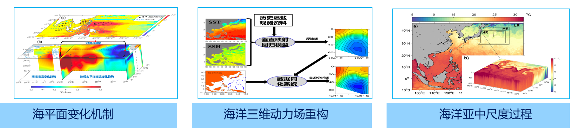 主要研究方向:海洋环流、海平面变化、中尺度和次中尺度过程、海洋内波、中尺度海气相互作用和海洋动力对海洋工程的影响及其生态效应。研究手段有现场观测、数值模拟、资料同化、理论分析等。