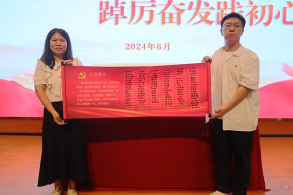 为鼓励新党员赓续党的光荣传统,会上由各支部毕业生党员代表,为2024年新入党党员佩戴党徽,这不仅是激励新党员亮身份、做表率,鞭策新党员坚守初心、勇担使命,埋头苦干、砥砺前行,更是共产党员间历史使命的不断传承。