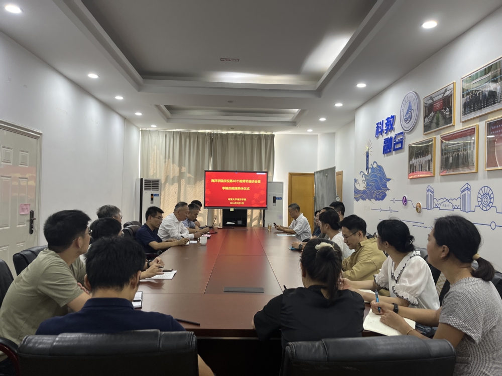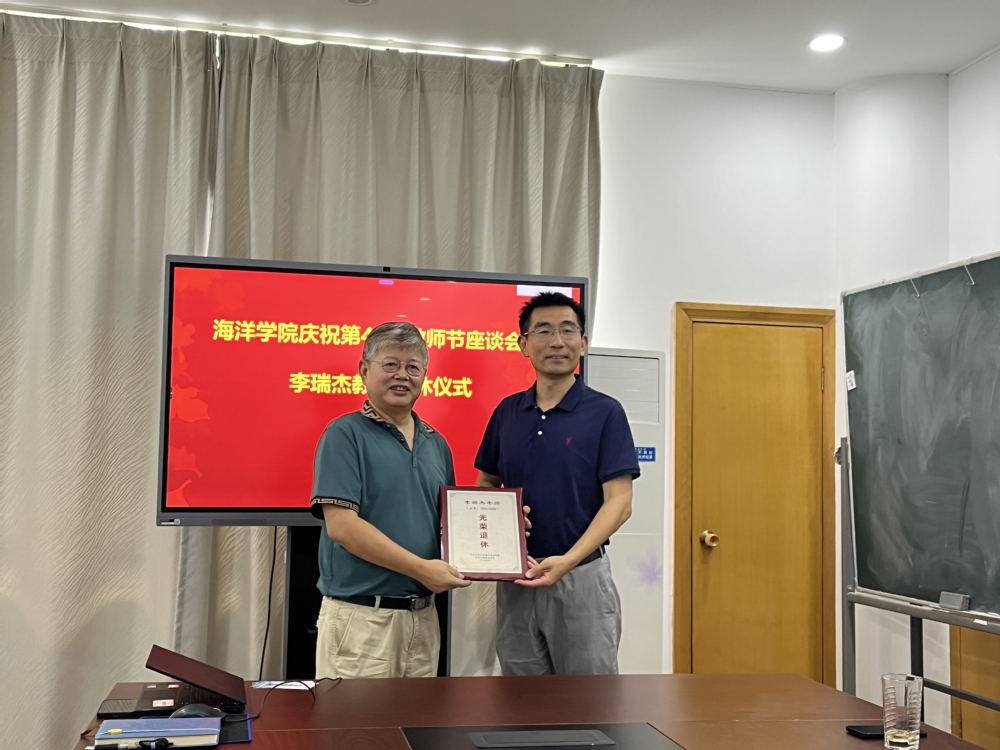 2024年9月9日,成人抖音 在电气馆407举行庆祝第40个教师节座谈会暨李瑞杰教授荣休仪式。学校教师思想政治工作督导组张俊基组长、学院党委胡忠华书记、宋翔洲院长、退休人员李瑞杰教授、海洋动力与环境研究所教师代表、全体教师党支部书记、新进教师、学生代表等参加了座谈会。座谈会由胡忠华书记主持。